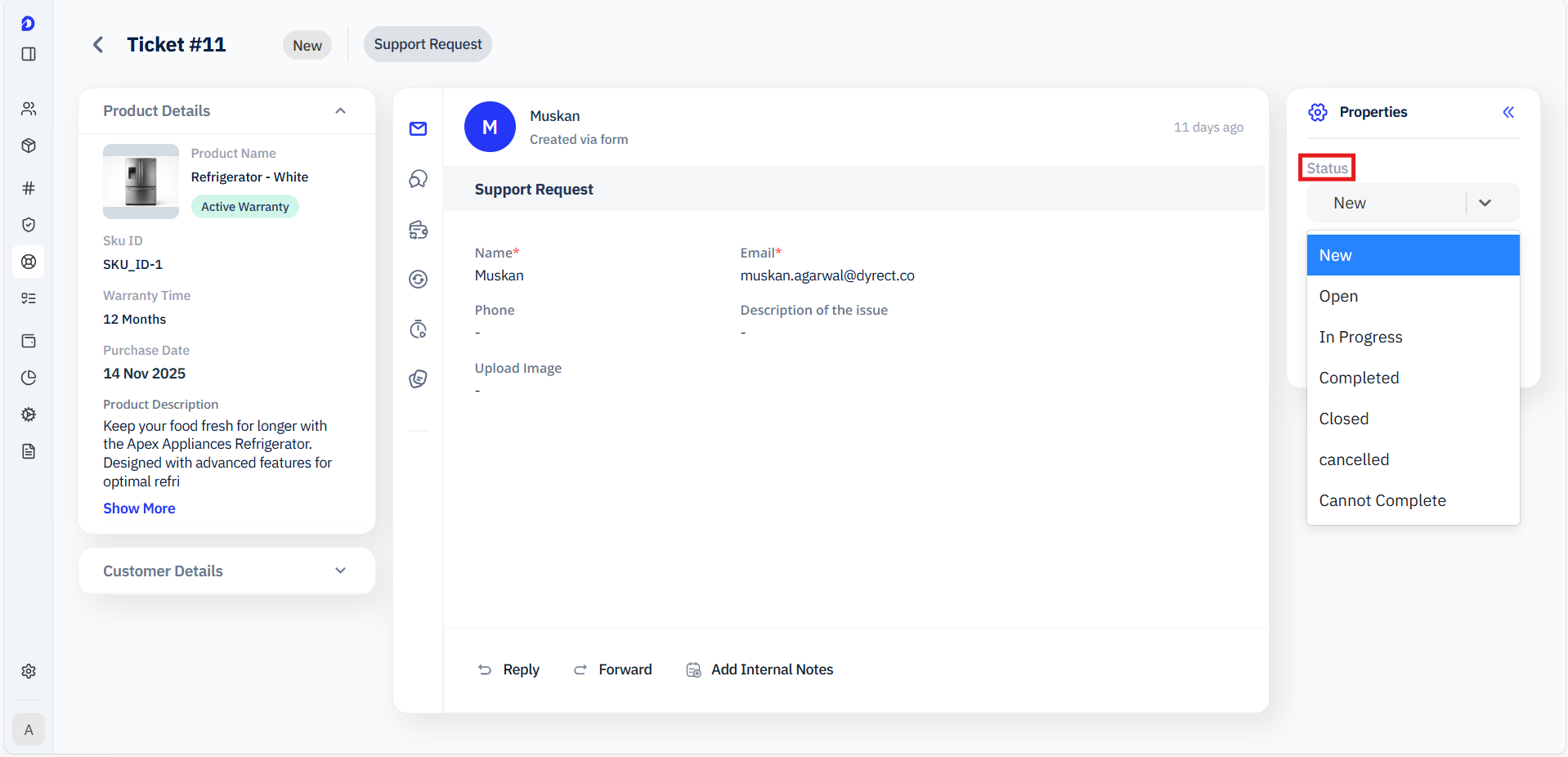 Changing the status of a support request helps track the progress of a customer’s claim or inquiry. Dyrect’s Back Office provides a simple status dropdown that allows internal teams to update ticket stages, ensuring transparency and keeping customers informed in real time. This guide explains how to change a ticket status and how notifications are sent to customers.