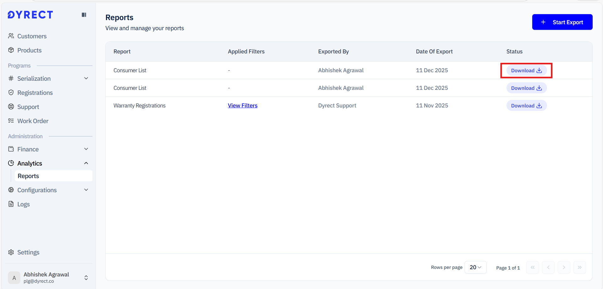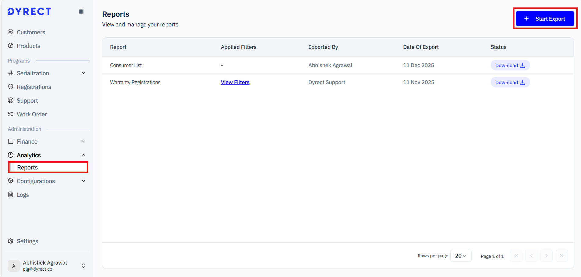 This guide will help you easily export data from the Dyrect platform. You can export various types of information such as registration data, customer lists, claim request details, dealer lists, and much more. Whether you need reports for analysis, internal tracking, or record-keeping, the steps below will walk you through the process in a clear and simple way.