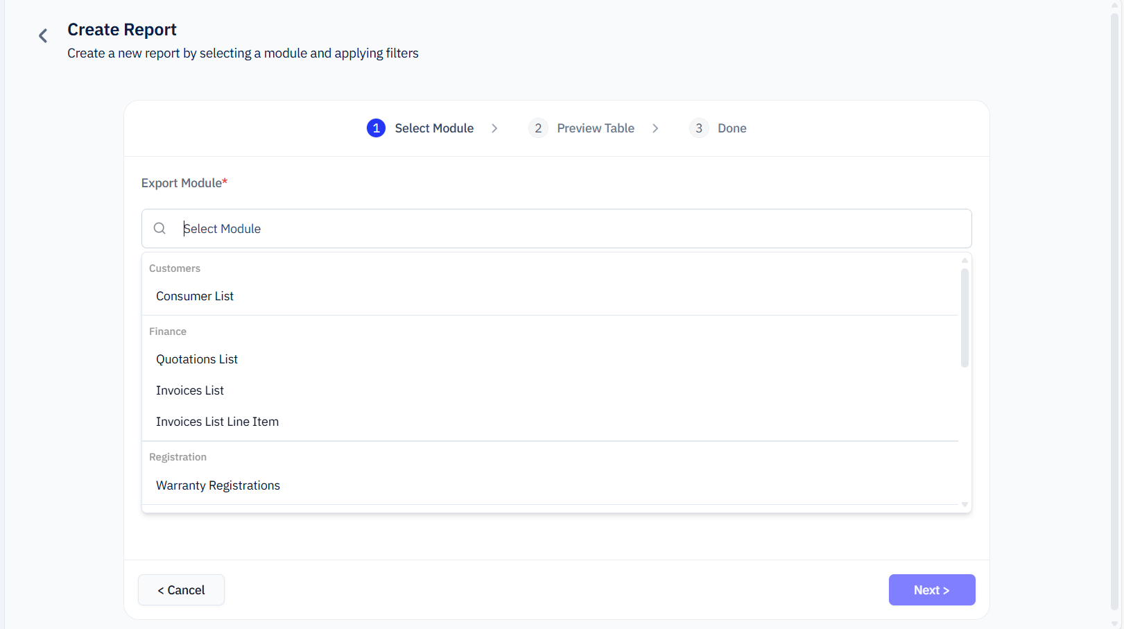- Select the module you want to export (for example: Registration Data, Customer Data, Claims Data, Dealer List, etc.).